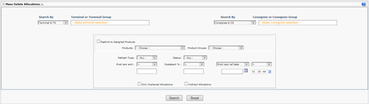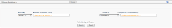 Choose Allocations panel: Provides a search tool for finding an existing allocation or for selecting a Terminal or Terminal Group and Consignee or Consignee Group for setting up a new allocation.