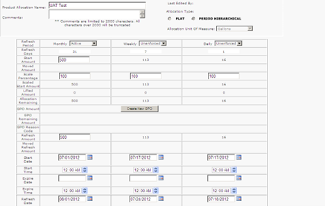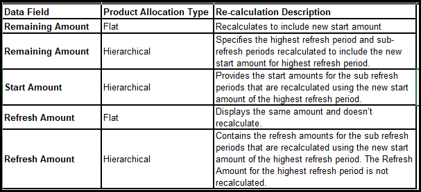 Hierarchical Product Allocations: Hierarchical product allocations can beset up automatically to be applied in a stair step or hierarchical fashion. Once you enter your base or starting refresh period and starting amount, the system calculates and auto-fill amounts and dates for the lower periods. For example, when you designate monthly as your base, and select weekly as your next stair step down, the system calculates a start amount and refresh date for the weekly refresh period.