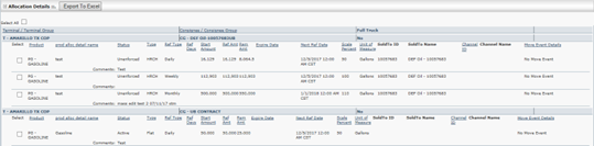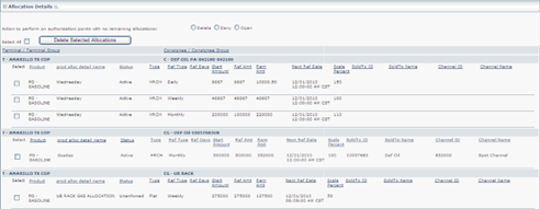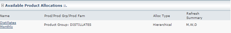 - In the Available Product Allocations panel, click the desired allocation name listed under the Name This panel displays product allocations for the selected terminal/terminal group and selected consignee/consignee group combination.