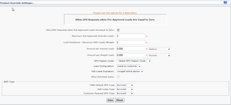 - Note: If a GPO is already in existence for the given combination and the addition of a single load via the Load Assistance Dashboard, this would cause the approved volume to be greater than the Load Assistance – Maximum GPO Loads Allowed x Gallons per load. The Load Assistance Dashboard doesn’t allow for the addition of volume. To add volume to a GPO in this situation, the user will need to go to the GPO Setup page. See the Global Product Override (GPO) – Borrowed & Incremental section in this manual for more information on GPO Setup page.
