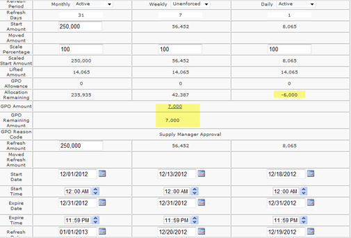 Borrowed GPOs operate by “borrowing” volume from a longer period allocation (for both flat and hierarchical allocations) to be lifted during the shorter GPO period. For example, if a customer has daily, weekly, and monthly allocations in place, and a GPO is approved in the first week of the month, the customer is able to load additional fuel above their daily limit. The extra lifts for that day apply against both the GPO and also against the active higher periods (monthly and weekly).
