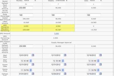 Flat Product Allocations: Flat product allocations can be set up to refresh on a daily, weekly, monthly, and/or tri-monthly basis. If needed, you can set up a custom refresh period. For each period, you can designate an allocation amount that is set independently of the others. For authorization purposes, the system applies the strictest allocation setting.