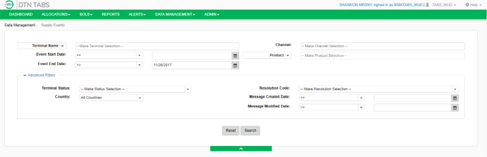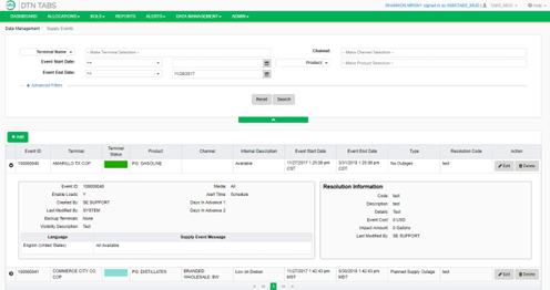 Finding events stored within DTN TABS is made easy by allowing users to enter various criteria related to the event or group of events desired. Terminal, Channel, Start Date, End Date or Product affected by the event can all be used to narrow search results. Advance filters allow users to further refine their search.