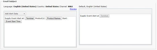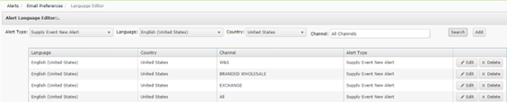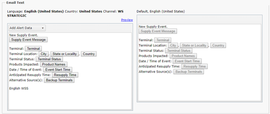 Messages can be configured in the Language Editor (Alerts > Email Preferences > Alert Language Editor) page. There are three types of supply event alerts: