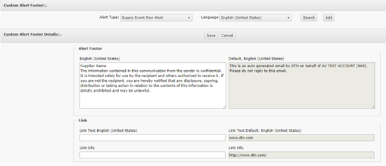 Each alert type within DTN TABS, including Supply Event messages, can have a custom footer message (Alerts > Email Preferences > Footer) that appears. Footer messages are created by language with each allowing for a unique URL.