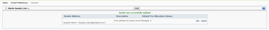 A custom Sender email address can be set up (Alerts > Email Preferences > Senders) so the alert appears to have come from your organization rather than DTN. It is recommended to use this feature when sending Alerts to customers to prevent confusion and enables them to reply to the Alert and get assistance from your Customer Service group or other area. Multiple Sender addresses can be set up so Credit Alerts appear to have been sent from the Credit Department and Product Alerts appear to have been sent from the Supply Department.