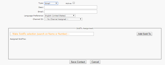 Individual contacts can be maintained within DTN TABS. A contact can be created for email, SMS email or SMS storing the appropriate email address or phone number. Language preference, channel and Sold To(s) can be assigned to each contact to control when and which message template is delivered.