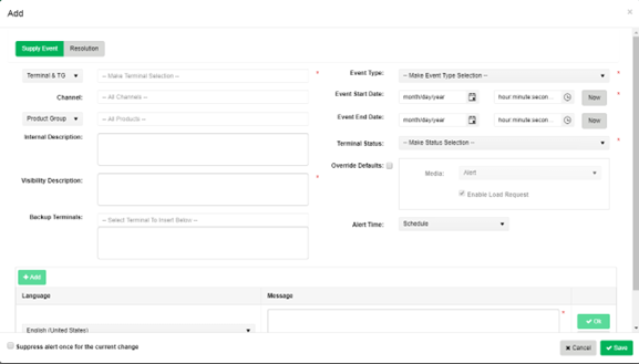 Once the desired event is found, all the data related to the event is displayed. Events can be edited allowing users to add additional information such as entering an event end date or event resolution information. Messages can be updated to deliver pertinent information to customers. If the user makes a change to an event and does not want a notification to be sent, the Suppress alert once for the current change field can be selected to avoid sending notifications.