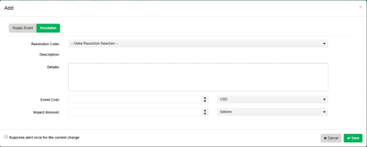 Users can setup and select specific resolutions codes, the specific details related to the event resolution, along with the cost and product volume impact.