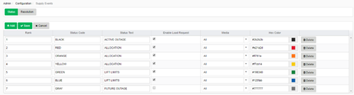 Reason codes are assigned to all Supply events. Configuring reason codes allows users to assign individual colors used to display terminal disruptions on visibility tools and within DTN TABS. Each reason code can specify default values for enabling load requests (GPOs) and the media setting controlling the delivery mechanism for the event message. These values can always be overridden when entering an individual event.