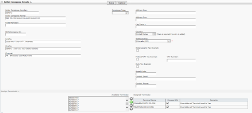 This can be diagnosed by using the Transaction Log Pro report and noting that there is a name in the Consignee Name column. If you click the hyperlink for the consignee number, you will then be sent to the Seller Consignee Details page where you can see that the terminal (in this example Amarillo) is not in the assigned terminals list.