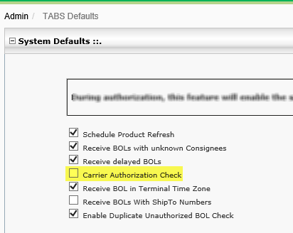 - The consignee exists, the terminal is assigned to the consignee in question and a deny is still occurring. This is caused by Carrier Authorization Check, an optional feature in DTN TABS. You would need to look at the Admin > TABS Defaults page within DTN TABS to see if this option is turned on.