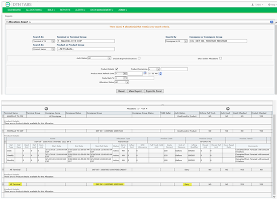 Two main issues within your DTN TABS database commonly cause the resulting denies. Both of these can be diagnosed by running an Allocation Report for the terminal and consignee receiving the error. You will then get one of two responses: