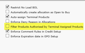 - Product allocations attached to the authorization points set to Credit and/or Product or Product have records attached but all records are set to Inactive (Flat allocation periods only) with no Active or Unenforced periods available for DTN TABS to clear products for loading.